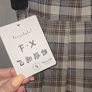 A chic pleated mini skirt in beige and gray plaid. Lightweight woven fabric with crisp pleats for a flattering silhouette. Easy-to-style neutral tones for versatile everyday wear.