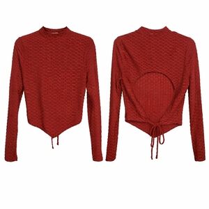 Stylish rust red long-sleeve top with textured fabric and a high neckline. Features an open back with adjustable tie for a customizable fit. Versatile and modern design perfect for day-to-night looks.