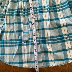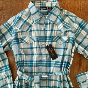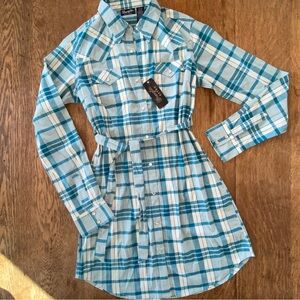 Elevate your wardrobe with this chic teal and white plaid dress. Designed with long sleeves and a flattering waist tie, it's perfect for any occasion.
