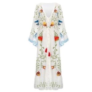 Authentic Fillyboo embroidered duster maxi dress with covered buttons and tassel ties. Worn once! Great summer dress and can also work as a maternity dress or worn unbuttoned like a kimono.