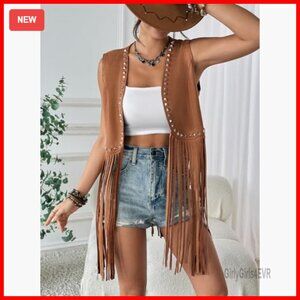 Faux Suede Fringe Vest with Studs, Sleeveless Western Boho Jacket