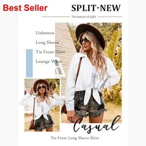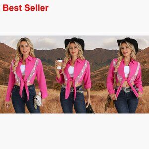 A Western-style top featuring intricate rhinestone fringe and a tie-front design. Perfect for adding a touch of cowgirl flair to concerts, rodeos, or themed parties. The rolled 3/4 sleeves offer a relaxed, versatile fit.