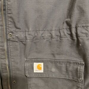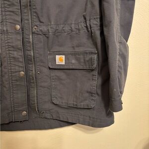 🖤 Durable Carhartt women’s utility jacket in charcoal gray with snap + zip front closure and multiple functional pockets. Lightweight ripstop-style fabric makes it perfect for layering in spring and fall.