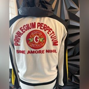 Authentic Gucci “Magnetismo Animale” tracksuit set featuring the iconic green panther embroidery and Privilegium Perpetuum back crest. Alessandro Michele era statement piece with bold graphic detailing and signature sporty-luxury aesthetic. Jacket is a Large and Pants Medium