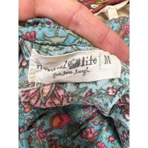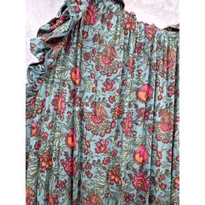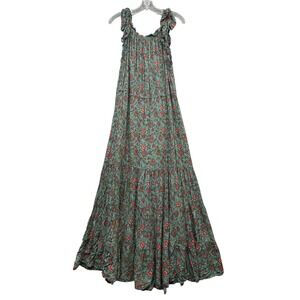 Natural Life boho maxi dress features a vibrant teal floral print on lightweight rayon fabric. This sleeveless tiered gown is designed with a ruffled scoop neckline and a front tie closure accented by red tassels and cowrie shell details. The flowy, relaxed silhouette and tiered skirt create a graceful, bohemian aesthetic perfect for summer festivals or beach outings.