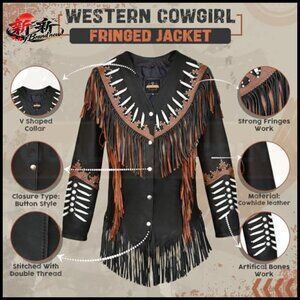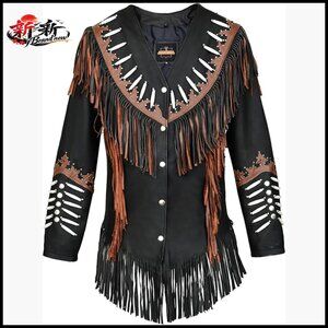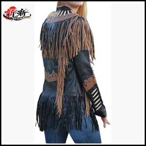 A classic western cowgirl jacket featuring a Native American beaded fringe design. Crafted for durability and style, suitable for casual occasions like motorcycling, parties, travel, and daily wear.