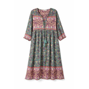 R. Vivimos boho floral midi dress featuring a vibrant mixed print design with paisley and floral patterns. Flowy silhouette with long sleeves and tassel tie neckline adds a relaxed, bohemian style.