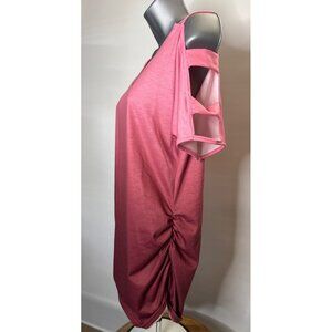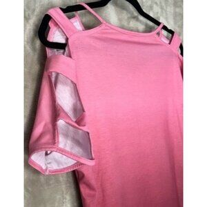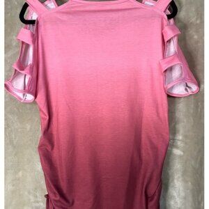 A professional-grade athletic top designed for performance and style. The gradient pink color transitions smoothly from light to deep rose, while strategic trendy cold shoulder and cutout sleeve details provide enhanced ventilation and modern aesthetic for fitness enthusiasts.