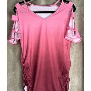 Women's V-neck short-sleeve top featuring a pink-to-burgundy gradient (ombre) design and cold-shoulder cutouts.