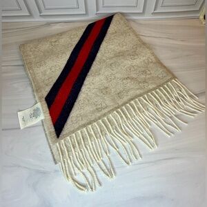 Gucci scarf, Gucci GG scarf, Gucci monogram scarf, Gucci wool scarf, Gucci web stripe, Gucci beige scarf, Gucci winter scarf, designer scarf, luxury scarf, Italian wool scarf, Gucci accessories, Gucci unisex scarf, classic Gucci, luxury winter accessories
