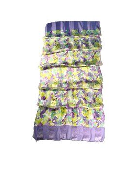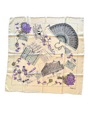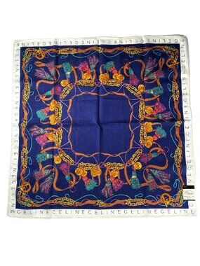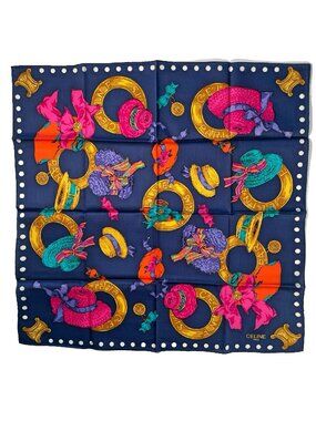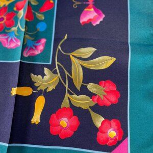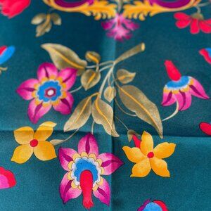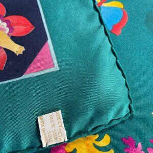 This generously sized square is perfect worn at the neck, styled as a headscarf, tied to a handbag, or framed as a collectible designer piece. The silk has a lovely sheen and fluid drape, with vibrant colors that remain eye-catching.