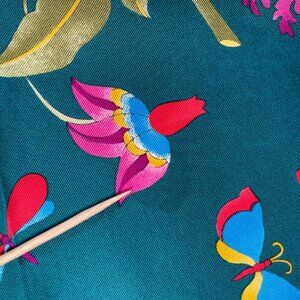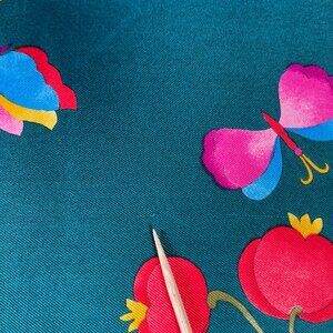 Vintage Gucci silk scarf featuring a vibrant floral and butterfly motif in rich green, navy, pink, blue, red, and gold tones. A beautifully detailed design with classic Gucci elegance and strong visual impact.