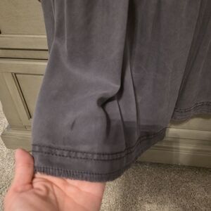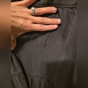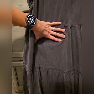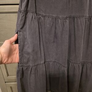 This Anthropologie Jenee tiered tunic dress is a washed black, sleeveless mini dress featuring a high neckline with pin-tuck detailing and ruffled shoulders. Shoulder to bottom of dress is approximately 35.5".