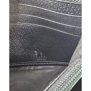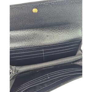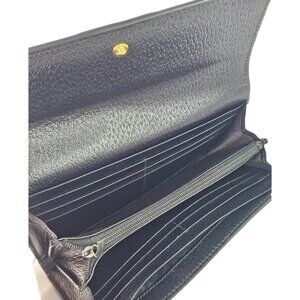 This sleek GUCCI Continental Wallet is crafted from smooth black calfskin leather and features the signature green and red Web stripe with a gold GG logo on the flap. The flap opens to a black leather interior, offering multiple card slots, a zipper compartment, and patch pockets for organized storage.