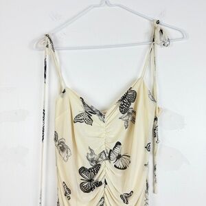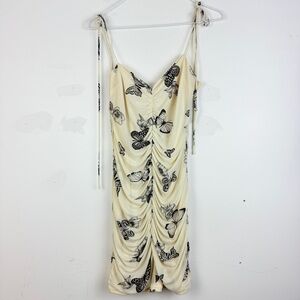 Dreamy butterfly print mini dress by Bailey Rose featuring a flattering ruched front and delicate tie straps. The soft cream base with black butterfly detailing gives it a romantic yet edgy Y2K vibe. Perfect for nights out, vacations, or styled casually with sneakers for a trendy everyday look.