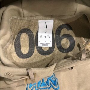 Off-White pullover hoodie in tan. Light blue embroidered logo and small swoosh accents. Front zippered pocket and kangaroo pocket. Drawstring hood for adjustable fit. Casual streetwear staple.