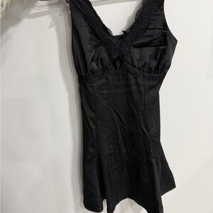 Sleeveless V-neck mini dress with lace trim. Flared skirt and fitted bodice. Smooth, lightweight fabric. Elegant and versatile for day or night.