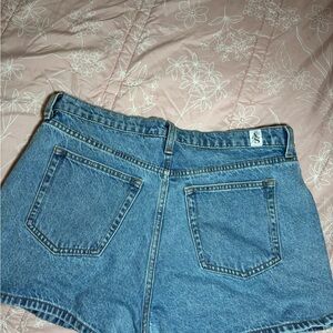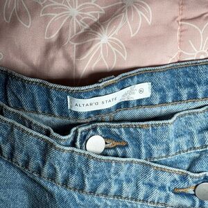 Altar'd State high-waist denim shorts with a wrap-front design. Asymmetric snap closure for a modern look. Soft light-blue wash ideal for warm-weather outfits. Pairs well with tanks, tees, or blouses.