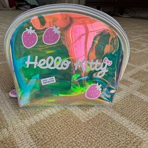 Adorable Hello Kitty cosmetic bag set featuring two iridescent holographic pouches with playful strawberry and character graphics. This matching duo includes one larger pouch and one smaller coordinating bag—perfect for organizing makeup, toiletries, travel essentials, or everyday accessories.