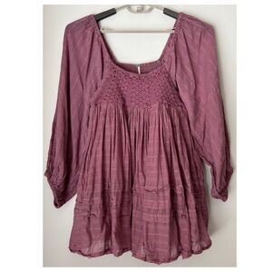 *The Free People Ari Mini Dress fuses whimsy and wonder with a tiered hemline and tight bodice combined with long puff sleeves.Pull-on styling. Front crochet detail at bust. Smocked back panel. Square neck. Long puff sleeves with elastic cuffs. Side seam pockets. Raw cut hem. Fully lined. 100% Cotton. Boho, feminine, whimsy, cottagecore, coquette.