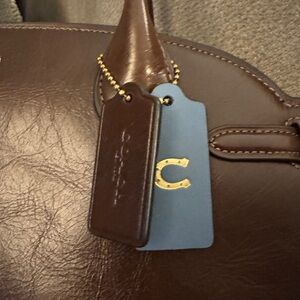 In brass/maple, which looks like a rich chocolate in person. Accent blue tag with horshoe in gold detail, removeable. Only used once.