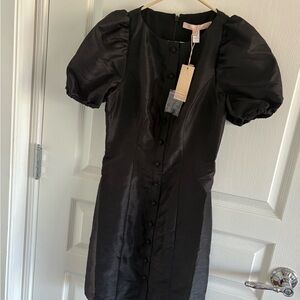 Elegant black mini dress with puff sleeves and a button-front design. Flattering straight silhouette ideal for day-to-night wear. Lightweight fabric with a polished, minimalist look. Easy to style with heels or sandals for a chic outfit.