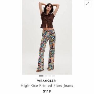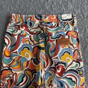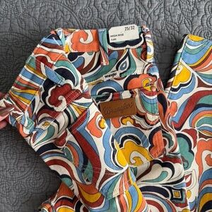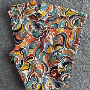 High-rise flare jeans with a vibrant swirl print. Bold, playful multicolor pattern. Flared leg for a retro silhouette.