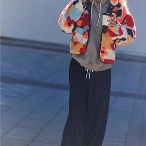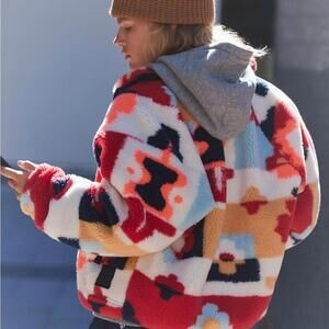 This cozy, oversized teddy jacket features a vibrant abstract floral or block print pattern with shades of red, orange, pink, and blue on a white background. It is designed with a button-up snap front, zippered hand pockets, and a slouchy silhouette that typically hits at the waist.