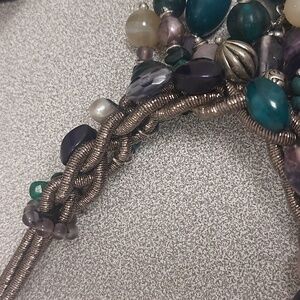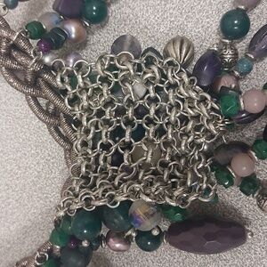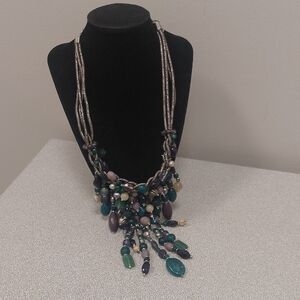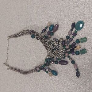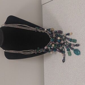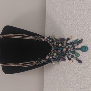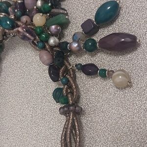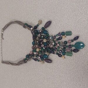 This stunning necklace features a blend of vibrant beads in shades of green, blue, and purple. Perfect for adding a pop of color to any outfit.