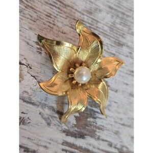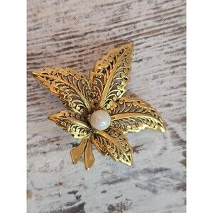 Vintage Gold Tone Brooch 4pc Lot Floral Leaf Pearl Rhinestone Starburst Pin #265