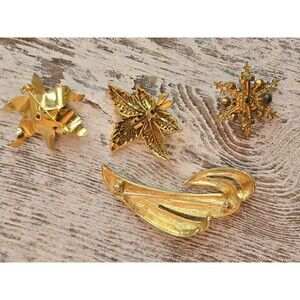 Includes a floral brooch with faux pearl center, a snowflake/starburst style brooch with pearls and rhinestones, a textured leaf brooch with pearl detail, and a modern curved swirl brooch.