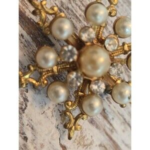 Vintage brooch lot featuring four gold tone pieces with pearl and rhinestone accents.
