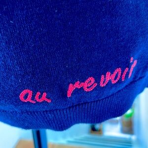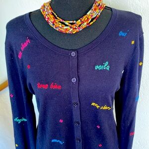 Talbots NWOT Deep Navy Blue Button down Sweater is covered in colorful French expressions. This delightful sweater has a 20 inch pit to pit measurement and boxy fit for comfortable wear. This button-down sweater goes with everything can be worn for work or play and a great layering piece. see all photos for additional measurements. Size large. Questions? Leave a comment below!