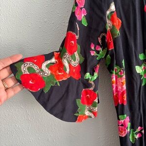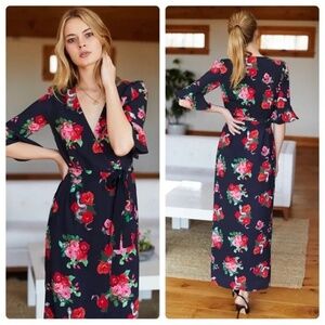 Elegant floral maxi dress. Features vibrant red roses. Navy background. Flattering wrap style. Perfect for any occasion.