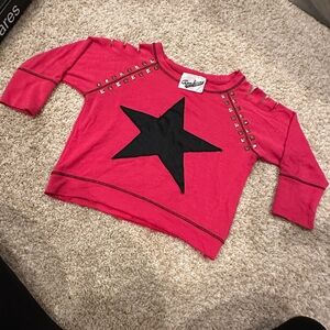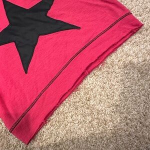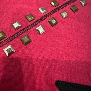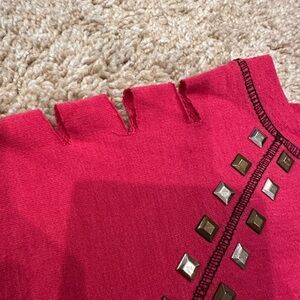 This stylish fuchsia pink from Random Hearts features a bold black star design. Cut outs in shoulders and studded design. Perfect for adding a touch of flair to any outfit.