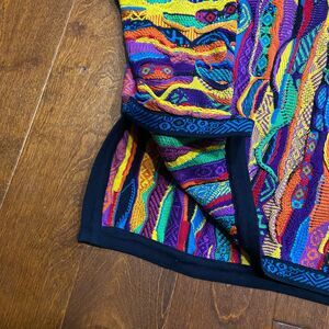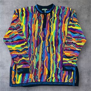 Add a pop of color to your closet with this COOGI Australia Vintage 3-D Knit 1/4 Zip Multicolor Sweater. This pre owned men's size XL pullover is crafted from soft 100% cotton and is in excellent condition. The intricate 3-D knit design and bold colors create a standout look that is perfect for any occasion. Stay stylish and comfortable with this long sleeve sweater that is sure to become a favorite in your rotation.
