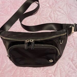 Brown with gold hardware beltbag by lululemon. Holds a lot! Can be worn crossbody, to the back, on your shoulder or around your waist. She does have a couple of small spots that can be cleaned. She has a small textured patch in front that you can put a pin or chains over and no one would see it. Otherwise she’s in like new condition. No odors.