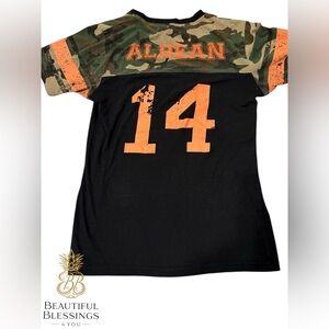 Short-sleeve V-neck tee with camo sleeves and orange lettering. Front reads "She's Country". Back features "ALDEAN" and large orange "14" (Aldean’s favorite number), graphic country style.