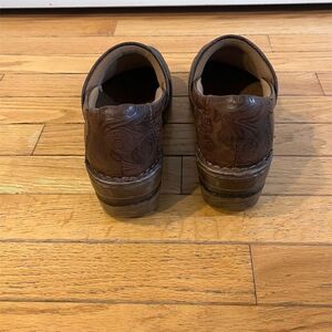 Keywords: BOC Born Concepts, women's clogs, brown clogs, casual shoes, floral pattern, slip-on clogs, comfortable footwear, durable clogs, everyday wear, pre-owned clogs, size 8.5, closed toe, floral tooled pattern, casual occasions, man-made material.