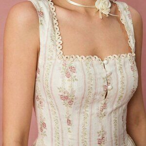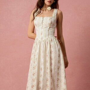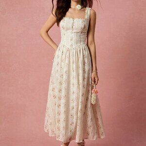 This elegant long princess dress features a romantic design with a square neck and sleeveless style. Made with a regular fit, it showcases an all-over print of plants in a beautiful, random pattern. The cream color adds a touch of femininity, while the A-line shape creates a flattering silhouette.