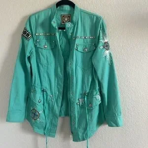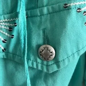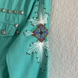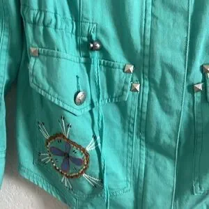 Double D Ranch turquoise jacket that features an Indian-inspired design. The jacket has accents of embroidered designs along with studs, rhinestones and patches. Adjustable waist drawstrings, hidden zipper with snap button closure, 4 button closure pockets, shirttail hem front and straight hem rear. No lining.