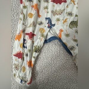 Cozy and fun dinosaur print footie pajamas for kids. Features a colorful design with easy snap buttons. Ideal for playful days and comfy nights.