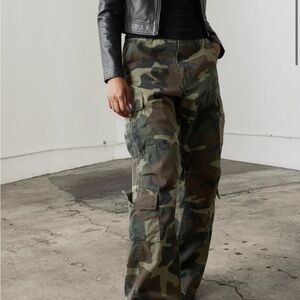 Relaxed fit cargo pants with multi-pocket utility design. Classic woodland camouflage print. Durable cotton fabric. Versatile everyday style.