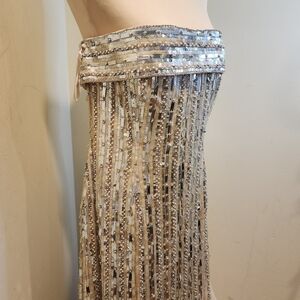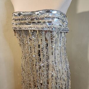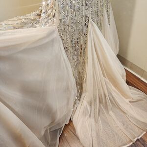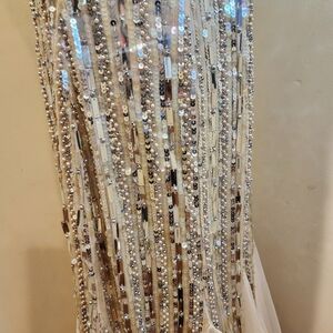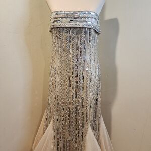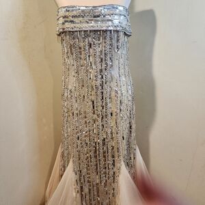 Elegant gown with silver sequins and cream fabric. Perfect for formal events.
