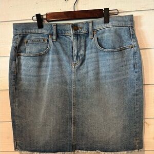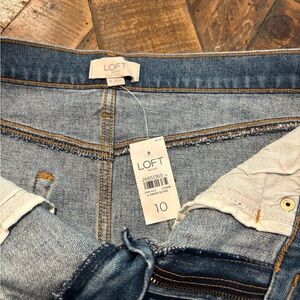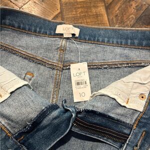 LOFT NWT Size 10 denim mini skirt with frayed edges . Upgrade your wardrobe with this stunning Ann Taylor Loft denim skirt. Designed with a raw hem, this skirt is perfect for casual occasions.