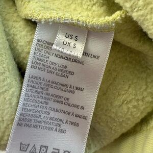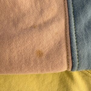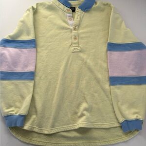 Soft pullover with a henley-style button placket. Pastel yellow body with blue collar, cuffs, and sleeve bands. Light pink stripe accents on the sleeves. Comfortable casual style for layering.