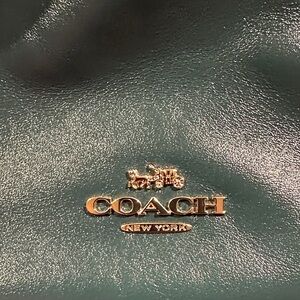 Sophisticated Coach shoulder bag in dark green leather. Features elegant gold chain details. Ideal for stylish outings.