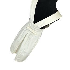Features: Soft denim fabrication, square-neckline, wide shoulder straps with snap-button closures, zipper details at the bust, button-front closures, V-shaped back with self-tying closure.