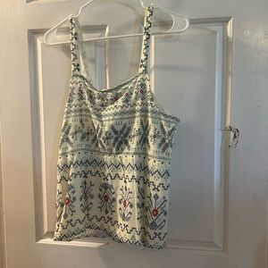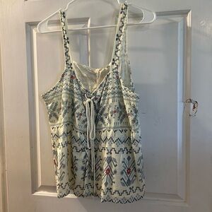 Cream camisole with blue geometric and floral embroidery. Red floral accents add subtle contrast. Adjustable straps and a front tie detail. Lightweight, breezy fabric ideal for warm days.NWT