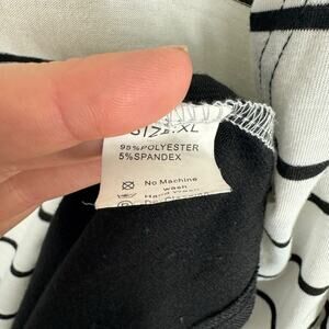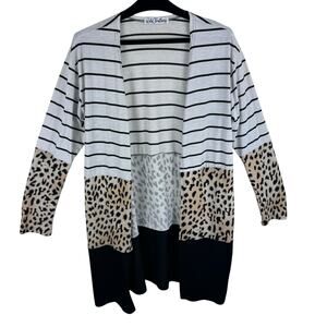 Excellent preowned condition. Black & white striped/leopard print/solid black long sleeve lightweight open blouse. Has stretch. Open pockets on lower sides. Polyester/spandex material. Approx. measurements: Shoulder to hem 40", pit to pit 24", sleeve from neck to sleeve hem 31". Size XL.